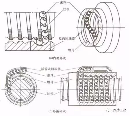 滾珠絲杠常用的循環(huán)方式有兩種:外循環(huán)和內循環(huán)。滾珠在循環(huán)過(guò)程中有時(shí)與絲杠脫離接觸的稱(chēng)為外循環(huán);始終與絲杠保持接觸的稱(chēng)為內循環(huán)。