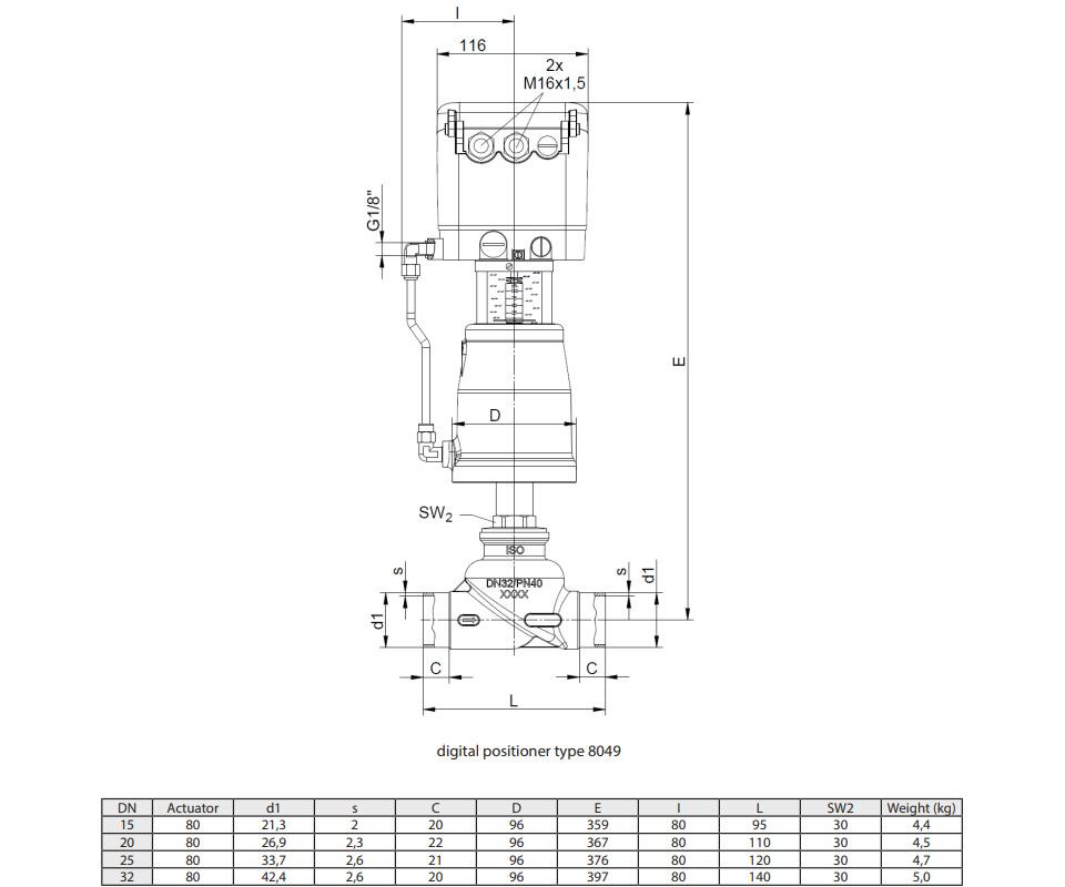 不銹鋼1.4310(執行器Ø 80 mm,膜片式執行器);彈簧鋼絲C,塑料包覆(執行器Ø 125 mm) |
